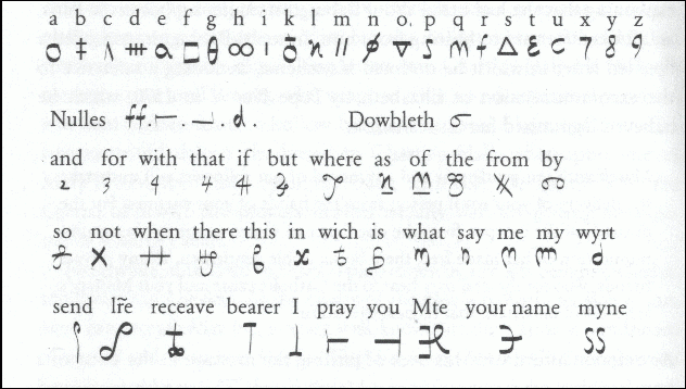 이건 새로운 언어를 만드라는 말이 아닙니다. 새로운 모양을 만들어서 그 모양의 한글 또는 영어를 지정해주는 겁니다. 또는 다음과 같은 스코틀랜드 여왕 메리가 사용했던 코드표를 이용해도 됩니다.